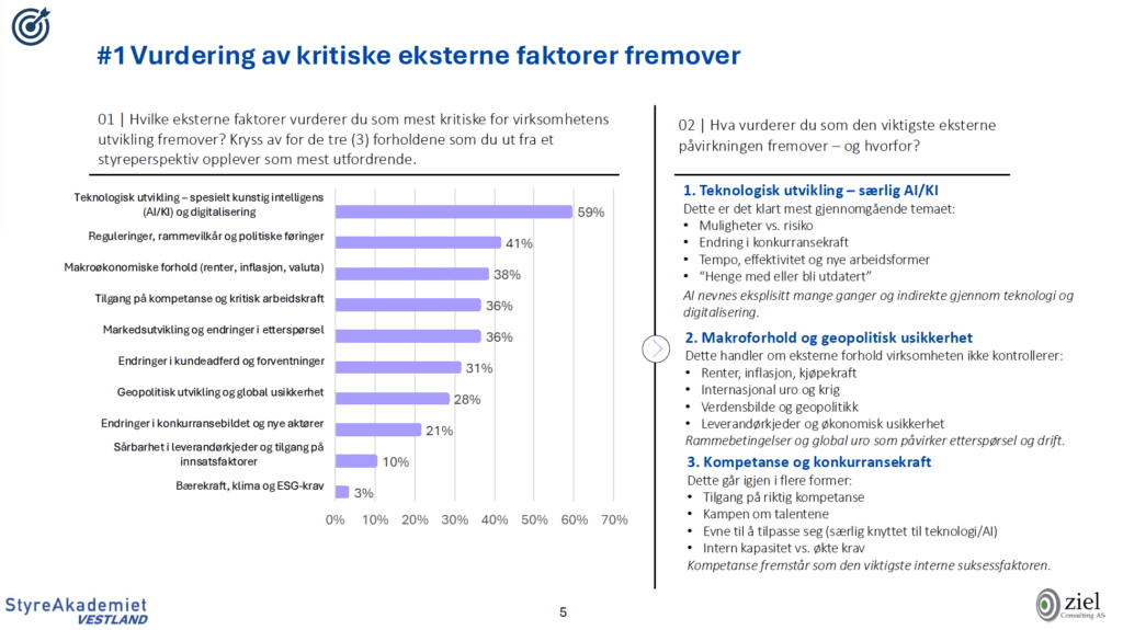 Når styrene peker på de viktigste eksterne faktorene fremover, er det én som skiller seg klart ut: Teknologisk utvikling, og da spesielt AI. Dette er ikke lenger et fremtidstema. Det er her og nå. Og det påvirker alt fra konkurransekraft til tempo og arbeidsformer. Samtidig ser vi at mer klassiske drivere fortsatt står sterkt: