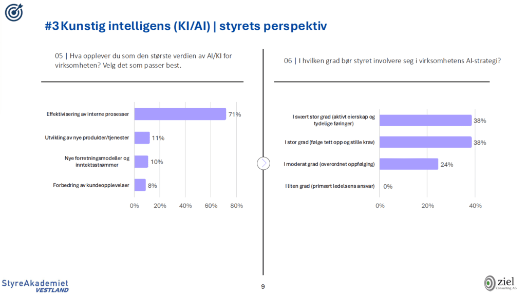 I forbindelse med Styredagen i regi av Styreakademiet Vestland gjennomførte vi en undersøkelse blant styreledere og styremedlemmer om hvilke faktorer som vil påvirke virksomheter fremover, og hvordan styrene vurderer egen rolle og kompetanse knyttet til AI.